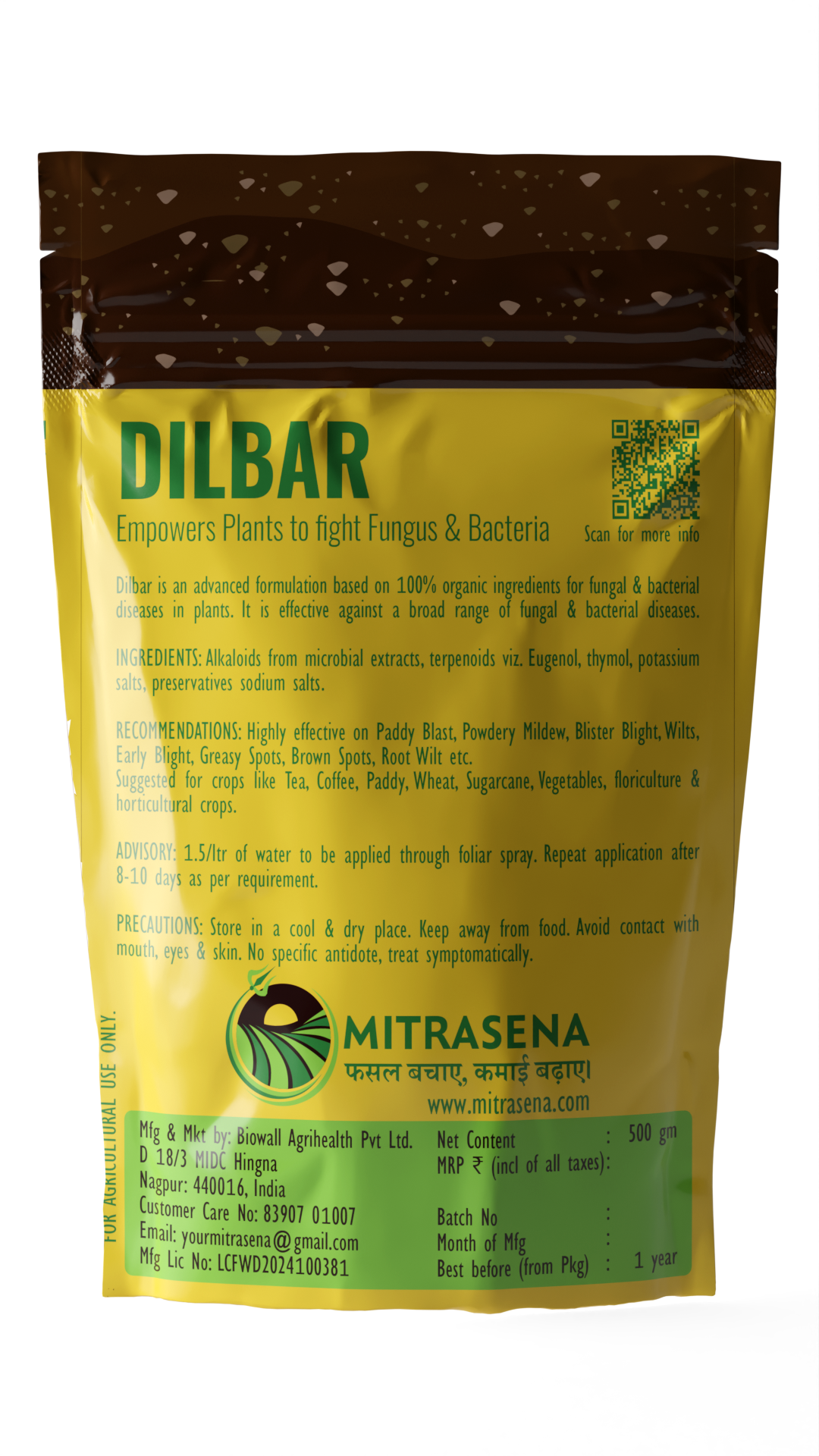 Dilbar is effective against Paddy Blast, Powdery Mildew, Blister Blight, Wilts, Early Blight, Greasy Spot, Brown Spot, Root Wilt, and other fungal & bacterial infections.